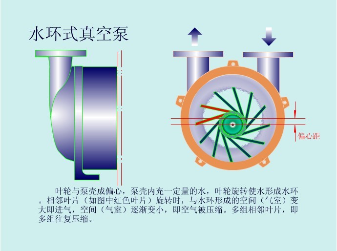 水環(huán)式真空泵圓柱形泵缸內(nèi)注入一定量的水,星形葉輪偏心地裝在泵缸內(nèi),當(dāng)葉輪旋轉(zhuǎn)時(shí),水受離心力作用被甩向四周而形成一個(gè)相對(duì)于葉輪為偏心的封閉水環(huán)!