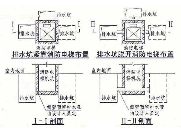 答:用于消防電梯井排水坑的潛水排污泵安裝方式,應(yīng)采用2臺(tái)硬管鏈接固定式安裝或2臺(tái)固定自耦式安裝,且排水坑有效容積不小于2.0m3,潛水排污泵的額定流量不小于36m3/h.消防電梯排水坑的平面布置可參照下列形式確定。