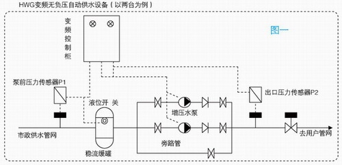 無(wú)負(fù)壓變頻供水設(shè)備 由變頻控制系統(tǒng)、無(wú)負(fù)壓穩(wěn)流罐、壓力傳感系統(tǒng)、負(fù)壓抑制系統(tǒng)、水泵、配套附件等組成,設(shè)備過流部分采用不銹鋼304材質(zhì)。罐式無(wú)負(fù)壓變頻供水設(shè)備 通過微機(jī)設(shè)定用戶所需的供水壓力,當(dāng)用戶的用水量增加,微機(jī)檢測(cè)到自來(lái)水的壓力低于用戶所需的用水壓力時(shí),微機(jī)會(huì)自動(dòng)控制變頻器啟動(dòng),管網(wǎng)壓力調(diào)節(jié)系統(tǒng)工作,直到使管網(wǎng)壓力增加到用戶所需的用水壓力時(shí),微機(jī)控制變頻器輸出一恒定的頻率,管網(wǎng)壓力調(diào)節(jié)系統(tǒng)以一恒定的壓力運(yùn)行,保證用戶用水壓力恒定。當(dāng)用戶的用水量減少,自來(lái)水的壓力逐漸恢復(fù)到用戶所需的用水壓力,微機(jī)控制變頻器輸出的頻率逐漸降低直至增壓泵停止運(yùn)行,系統(tǒng)充分利用了自來(lái)水原有的壓力,又保證了用戶供水壓力的穩(wěn)定。