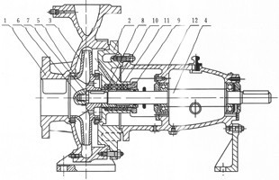 IS、IR型泵系根據國家標準ISO2858所規(guī)定的性能和尺寸設計的,主要由泵體(1)、泵蓋(2)、葉輪(3)、軸(4)、密封環(huán)(5)、軸套及懸架軸承部件(12)等所組成。