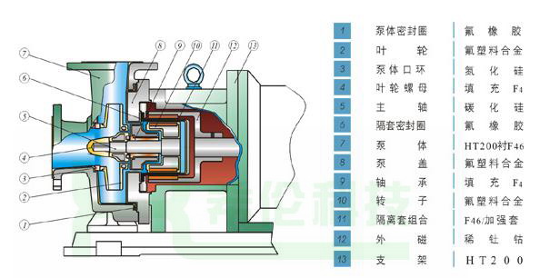 CQB-F磁力驅(qū)動(dòng)離心泵(簡稱磁力泵)是應(yīng)用現(xiàn)代磁力學(xué)原理,利用永磁體實(shí)現(xiàn)無接觸間接傳動(dòng)的一種化工流程泵。當(dāng)電機(jī)帶動(dòng)外轉(zhuǎn)子(即外磁鋼)總成旋轉(zhuǎn)時(shí),通過磁場的作用磁力線穿過隔離套帶動(dòng)內(nèi)轉(zhuǎn)子(即內(nèi)磁鋼)總成和葉輪同步轉(zhuǎn),介質(zhì)完全封閉在靜止的隔離套內(nèi),從而達(dá)到無泄漏抽送介質(zhì)的目的,徹底解決了機(jī)械傳動(dòng)泵的軸封泄漏,是全密封、無泄漏、無污染的新型工業(yè)泵。磁力泵是化工流程中杜絕跑、冒、滴、漏現(xiàn)象,消除環(huán)境污染,創(chuàng)造“無泄漏車間”、 “無泄漏工廠,實(shí)現(xiàn)安全、文明生產(chǎn)的理想用泵。