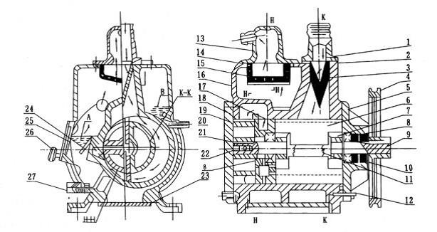 7、2X旋片式真空泵抽氣過程:見圖2,氣體由進(jìn)氣嘴進(jìn)入高真空室,起初是高壓強(qiáng),高低真空室都充滿大氣,兩個排氣門都打開排氣。隨著抽氣的進(jìn)行,氣壓下降(即真空度提高),高真空室壓力不足以推開排氣門,氣體經(jīng)中隔板進(jìn)入低真空室,此時壓力亦不足推開排氣門,但低真空室進(jìn)入有一定量油,幫助推開排氣門,氣體亦隨之排出。排出的氣體平雜著的油粒,經(jīng)擋油網(wǎng)濾而使油分離,只有氣體排出泵外,氣體路徑見圖2。