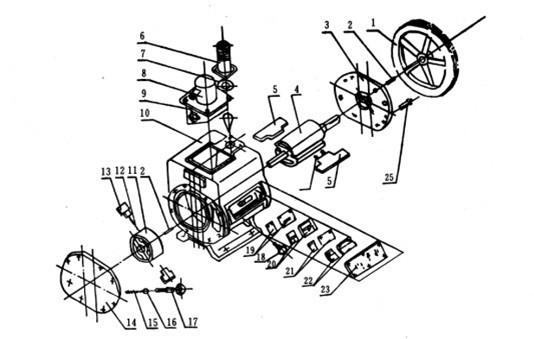 2X旋片式真空泵由泵體、高轉(zhuǎn)子、低轉(zhuǎn)子、前端板、后端板、高轉(zhuǎn)片、低轉(zhuǎn)片、排氣閥、排氣罩、視鏡等零部件組成。見圖2、圖3。