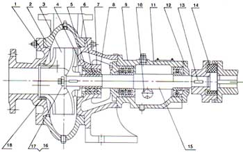 4、依次裝上軸承體、軸承(4PW無)油封圏及墊圈、葉輪、墊片和葉輪螺母并擰緊,然后裝上泵體和泵蓋。