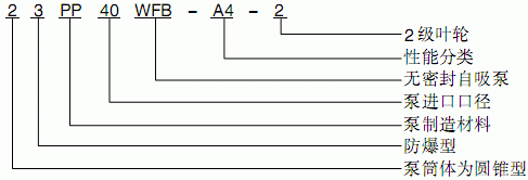 假設(shè)水泵的要求是:造型為圓錐型防爆型,其它要求同上,這臺(tái)水泵的完整型號(hào)為“2.4BXG40WFB-A4-2”。