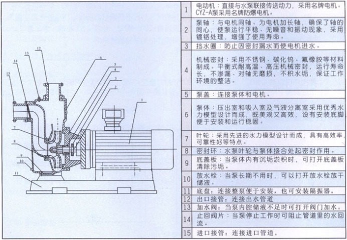 1、電動機:直接與水泵聯(lián)接傳送動力,采用名牌電機。CYZ-A泵采用名牌防爆電機。