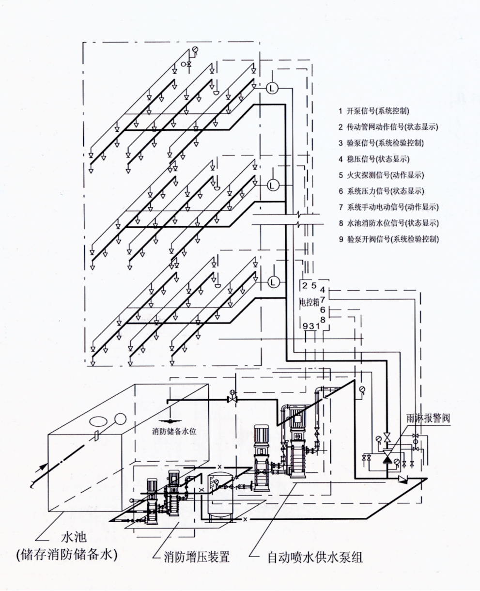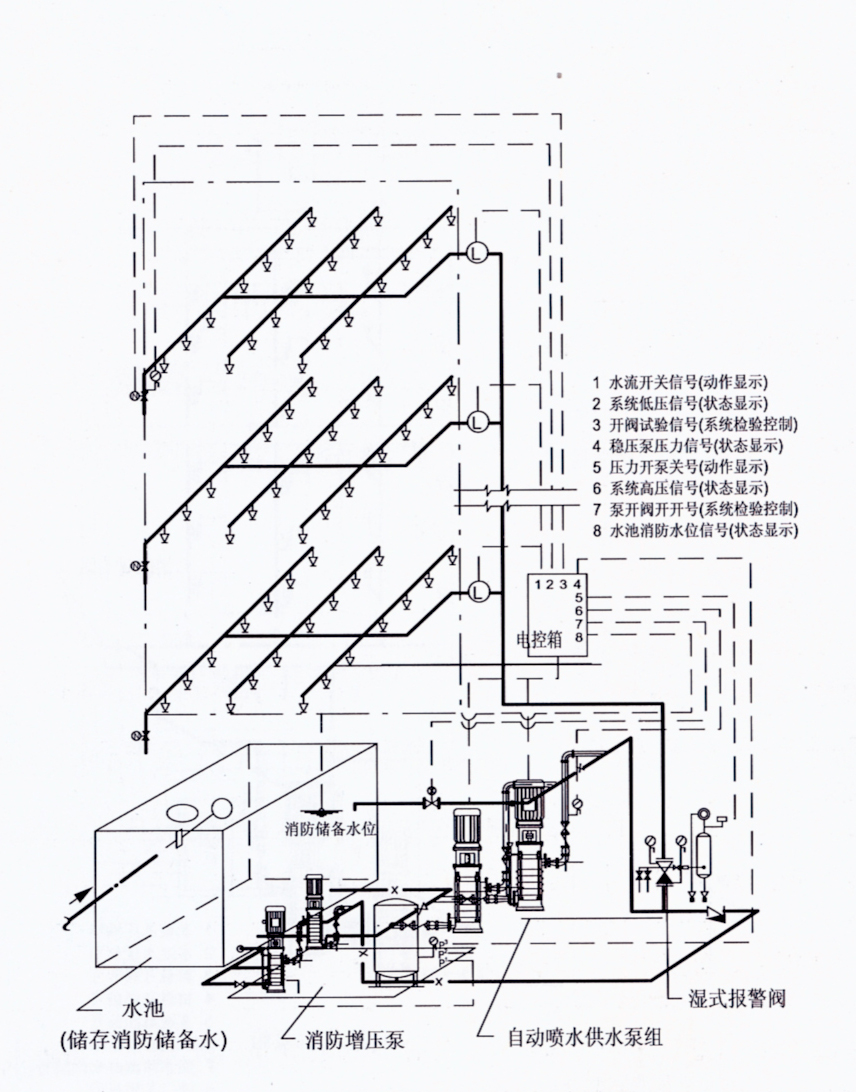 自動噴水濕式系統(tǒng)(高水箱穩(wěn)壓)原理圖
